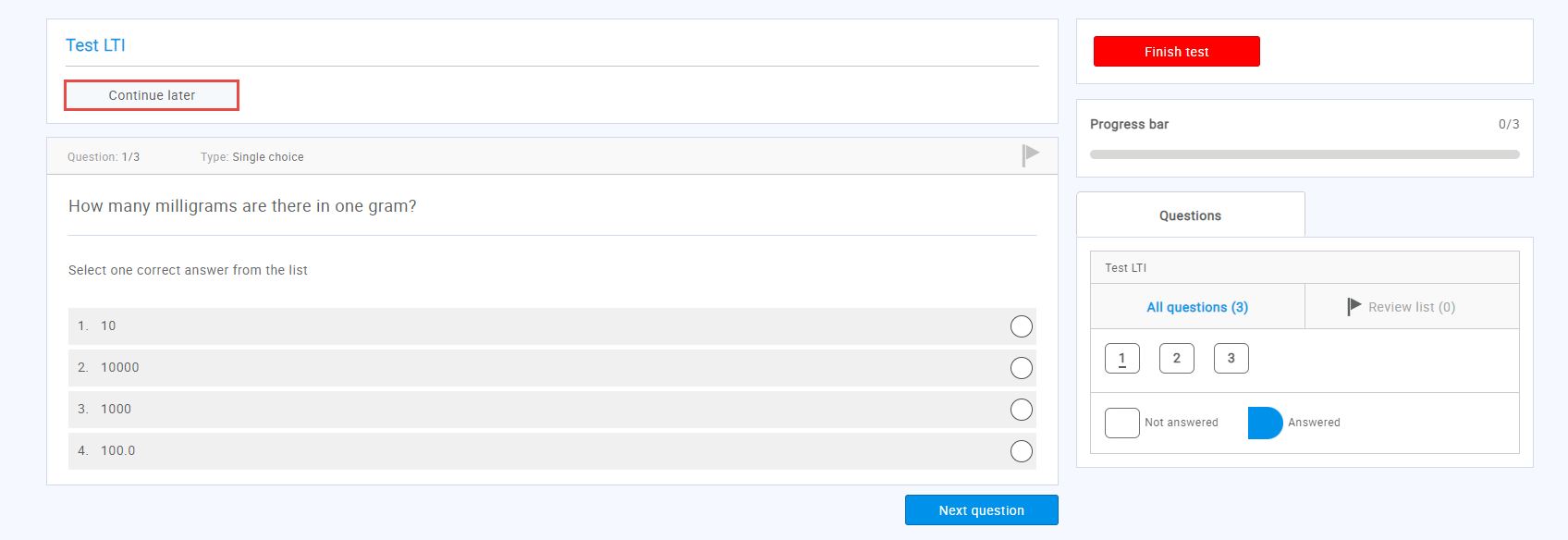 If the test continuation is allowed, the candidates can click the “Continue later” button on the test-taking page and then continue the test later in the same way they started the test. The same rules apply if the test is interrupted for some reason (e.g., lost internet connection).