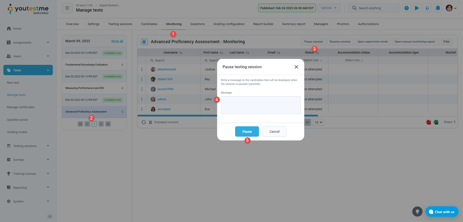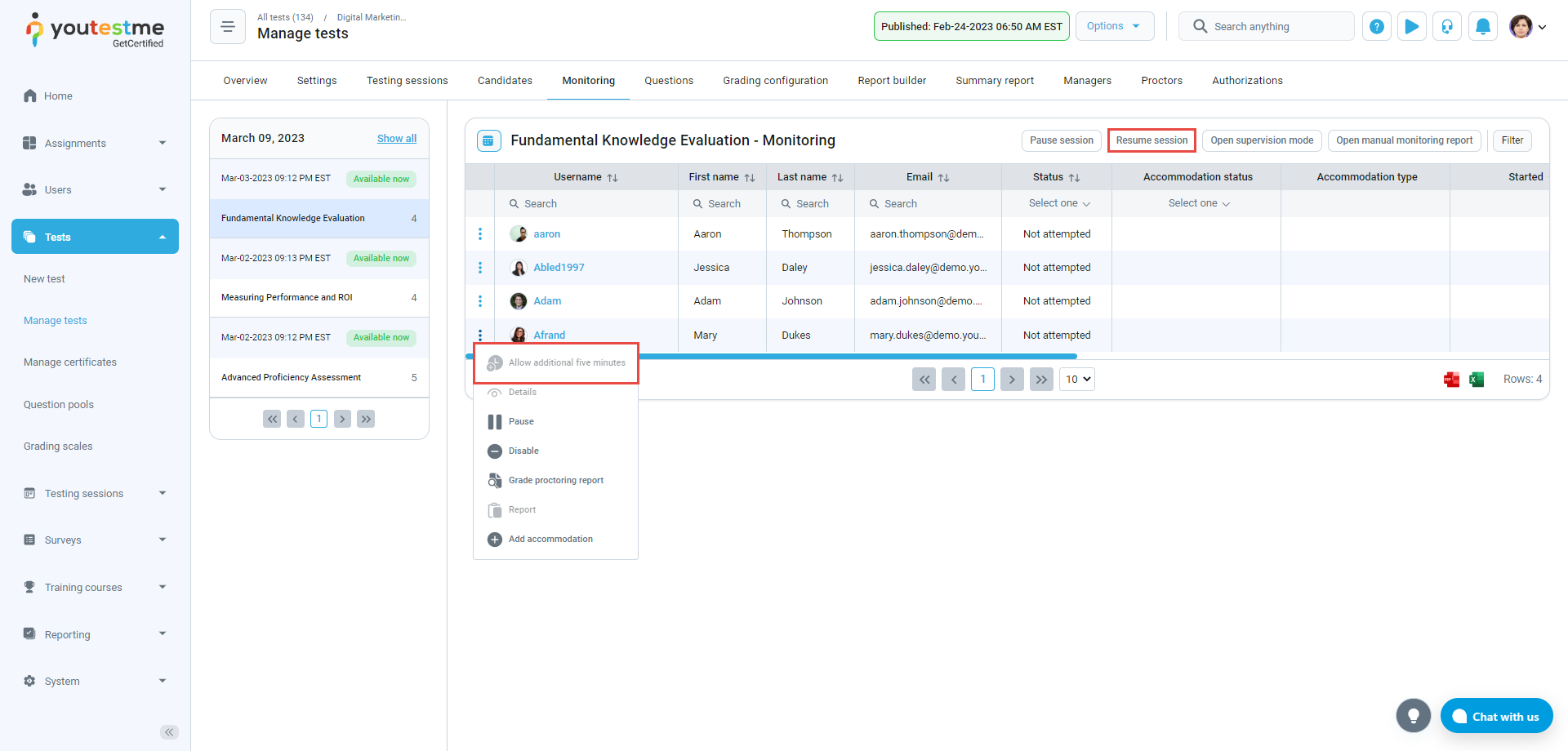 Once the proctor has completed the check-in process for all candidates, they need to resume the session by clicking the Resume session button.