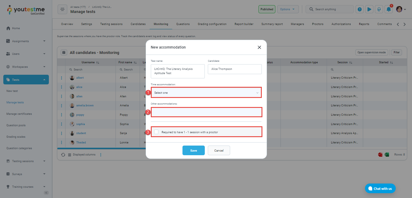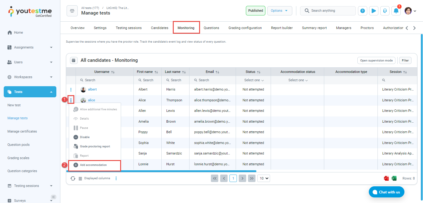Navigate to the Monitoring tab, click three dots, and select the Add accommodation option for the specific candidate.