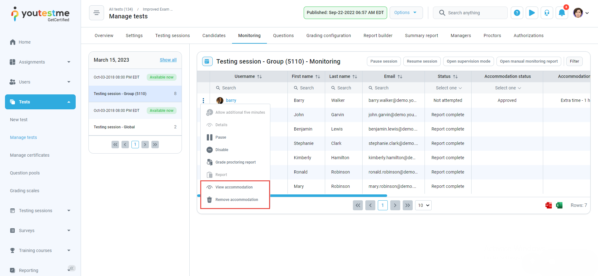 1. Required 1-1 session with a proctor – This type of accommodation can be used in a situation where a proctor’s extra assistance is needed, such as reading questions at load, etc.