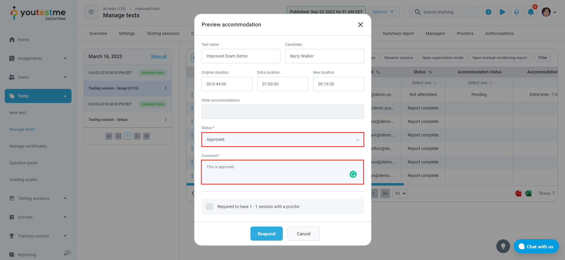 When a proctor is presented with a special accommodation request, they can take action by selecting the Respond button. This will bring up a pop-up dialog where the proctor can review the details of the accommodation and either approve or decline the request. Additionally, the proctor can add a comment to provide additional context and information about their decision. Once the proctor has made their decision, they can set the status of the accommodation request to reflect their decision.