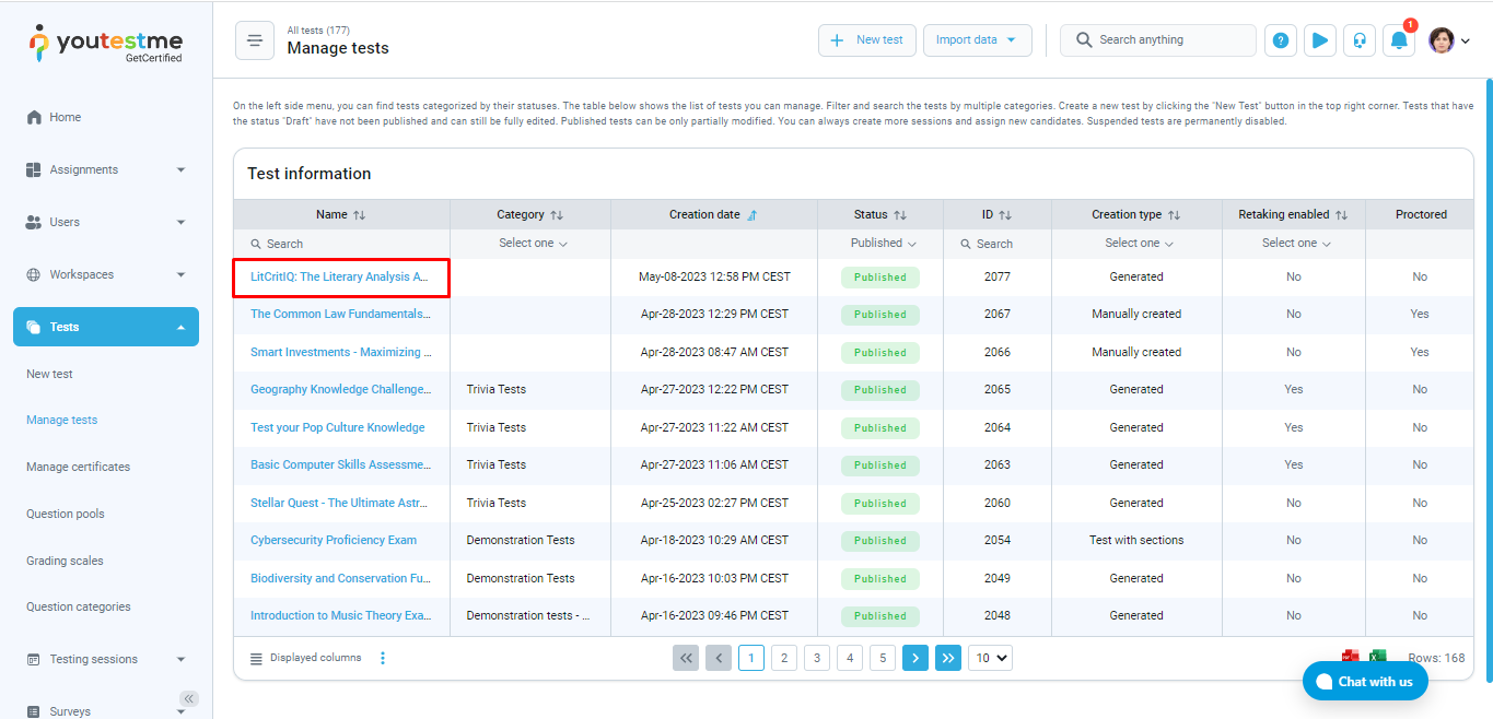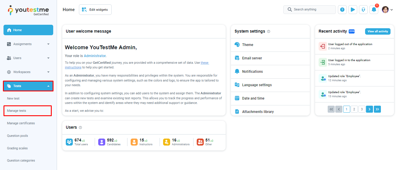 To add special accommodation, a test organizer should navigate to Tests and select the Manage tests.